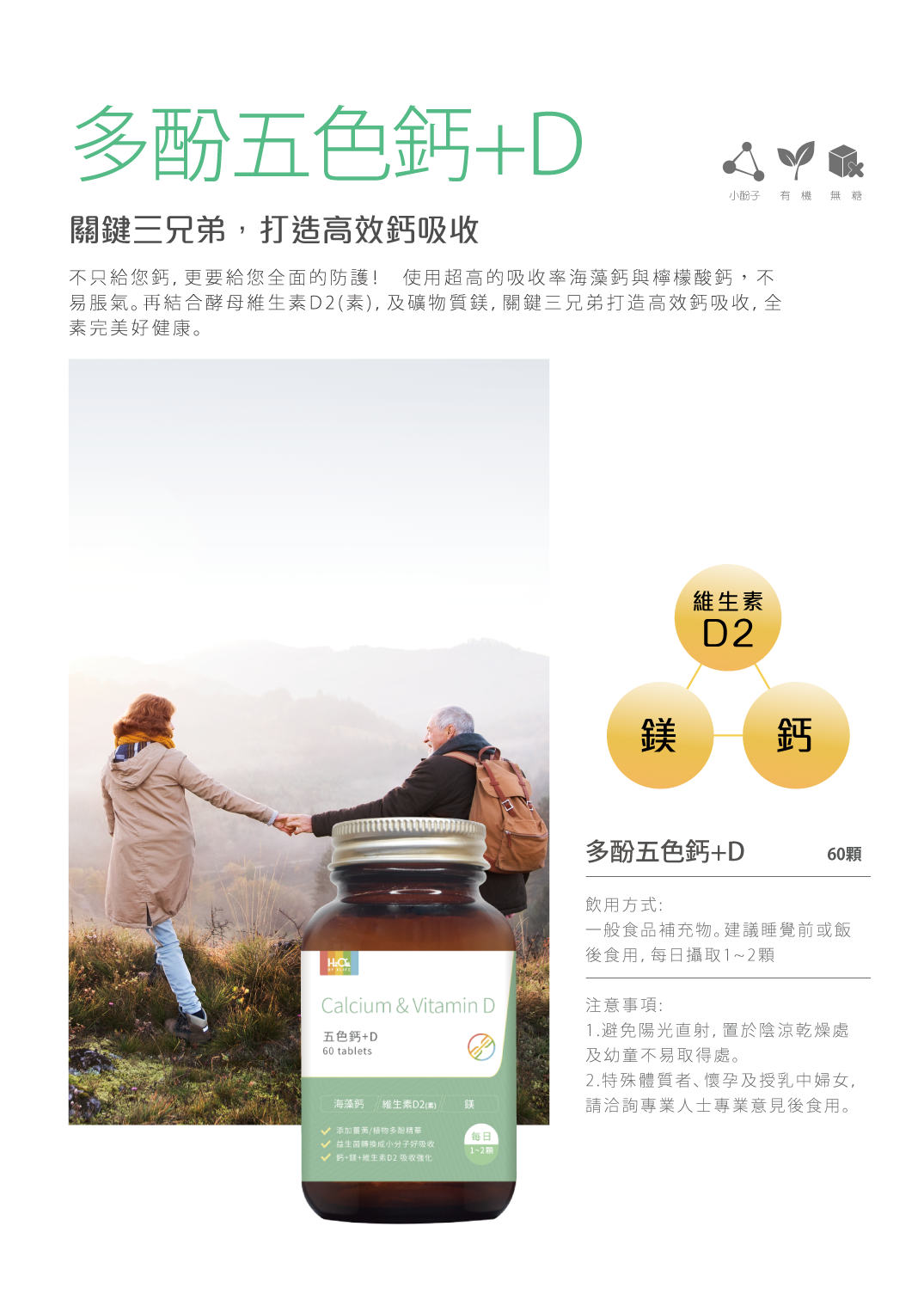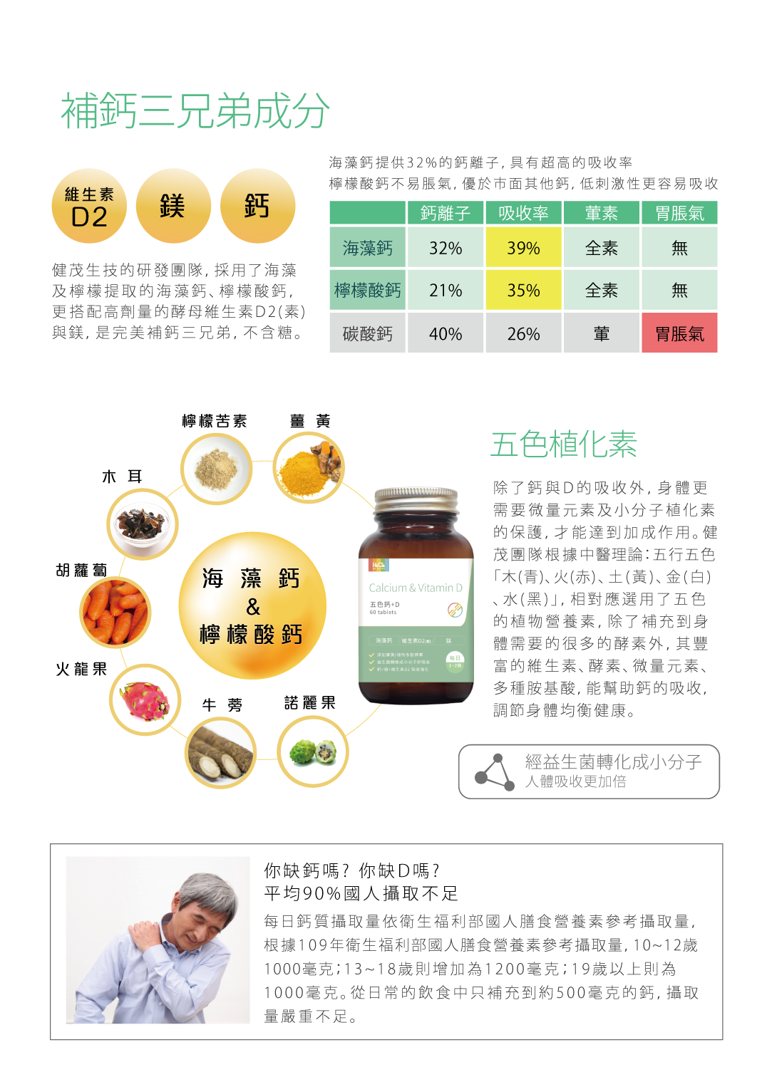 不只給您鈣,更要給您全面的防護! 海藻鈣提供32%的鈣離子,具有超高的吸收率。 檸檬酸鈣不易脹氣搭配400IU的酵母維生素D2(素),及礦物質鎂,全素。