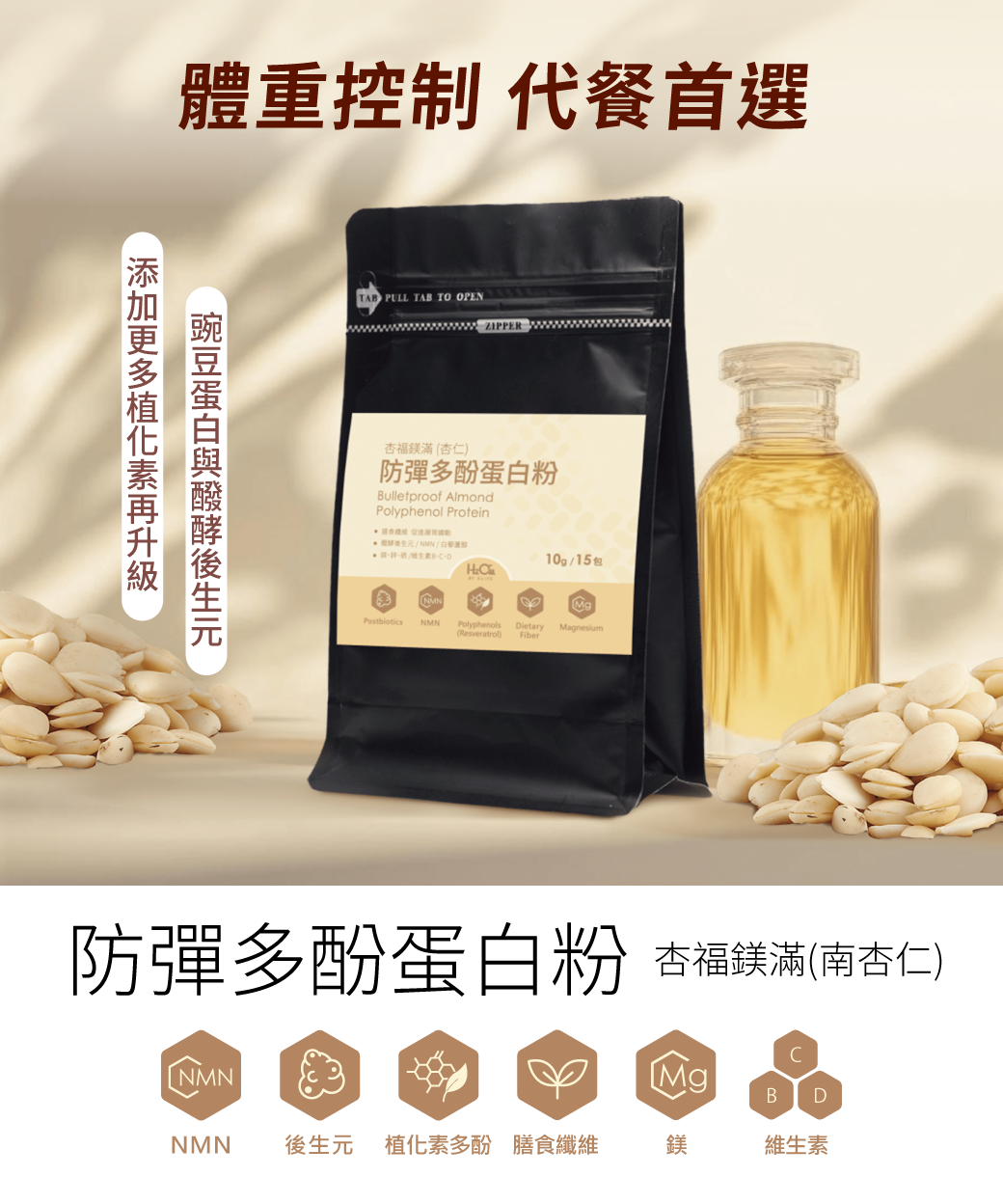 防彈多酚蛋白粉 杏福鎂滿(杏仁) (150g/1包)