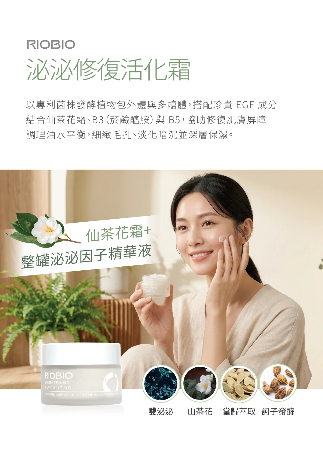 將植物包外體跟多醣體 及 各種 生長EGF等珍貴的原料用專利菌株發酵並 搭配原來的仙茶花霜 及 B3 (菸鹼醯胺) B5 來修復屏障、控油、細緻毛孔、淡化暗沉及保濕