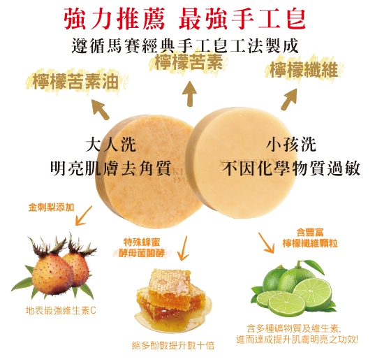 主要成分為發酵後的檸檬苦素油、檸檬苦素、檸檬纖維 經由特殊的蜂蜜酵母菌發酵,將總多酚數提升數十倍。 將發酵後的檸檬苦素及檸檬纖維以低溫烘烤至完全去除水分後 一部分浸泡於嚴選的植物油,另一部分進行萃取研磨。 . 【檸檬苦素手工皂】的檸檬纖維顆粒,可以溫和去除肌膚上的老廢角質促進肌膚之新陳代謝,讓皮膚經由清潔