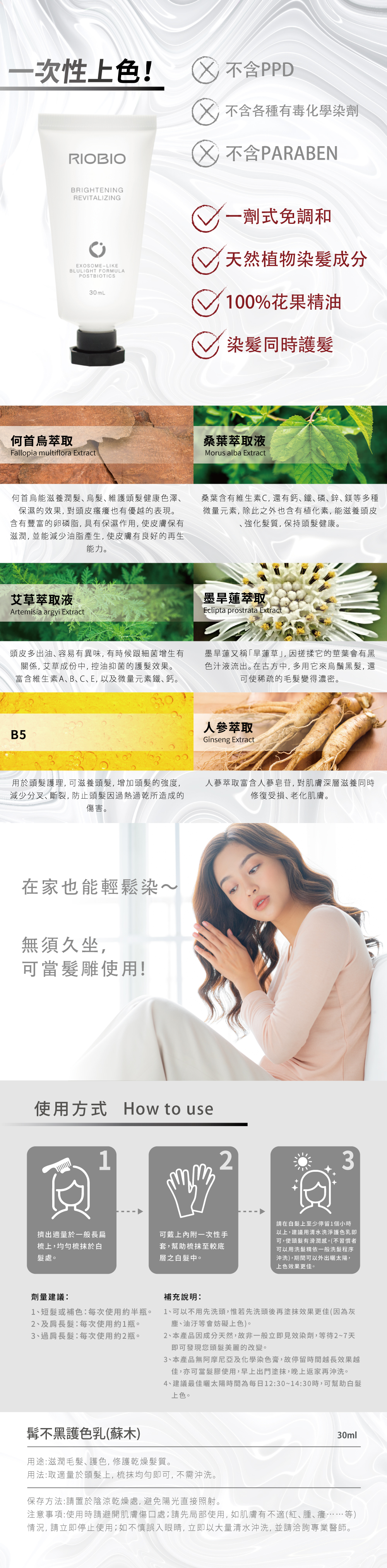《RIOBIO蘇木 髯不黑護色乳 / 噴霧》 草本益生菌萃取,含有何首烏 / 墨旱蓮 / 人參 / 艾草/ 桑葉 護頭髮健康色澤、保濕的效果,滋養潤髮✨ 含有豐富維生素A B C E 及礦物質 除此之外也含有植化素。能滋養頭皮、強化髮質,保持頭髮健康。