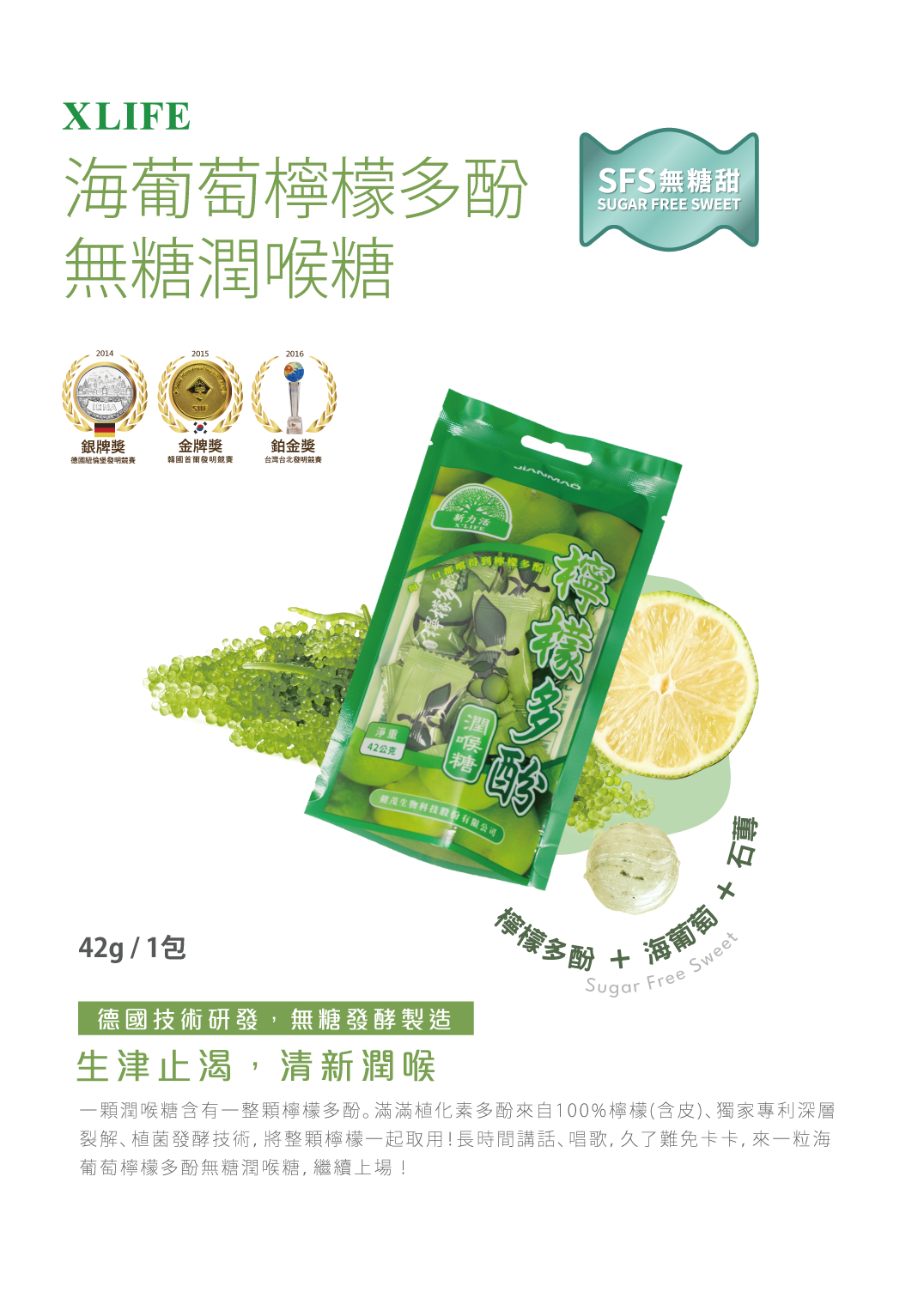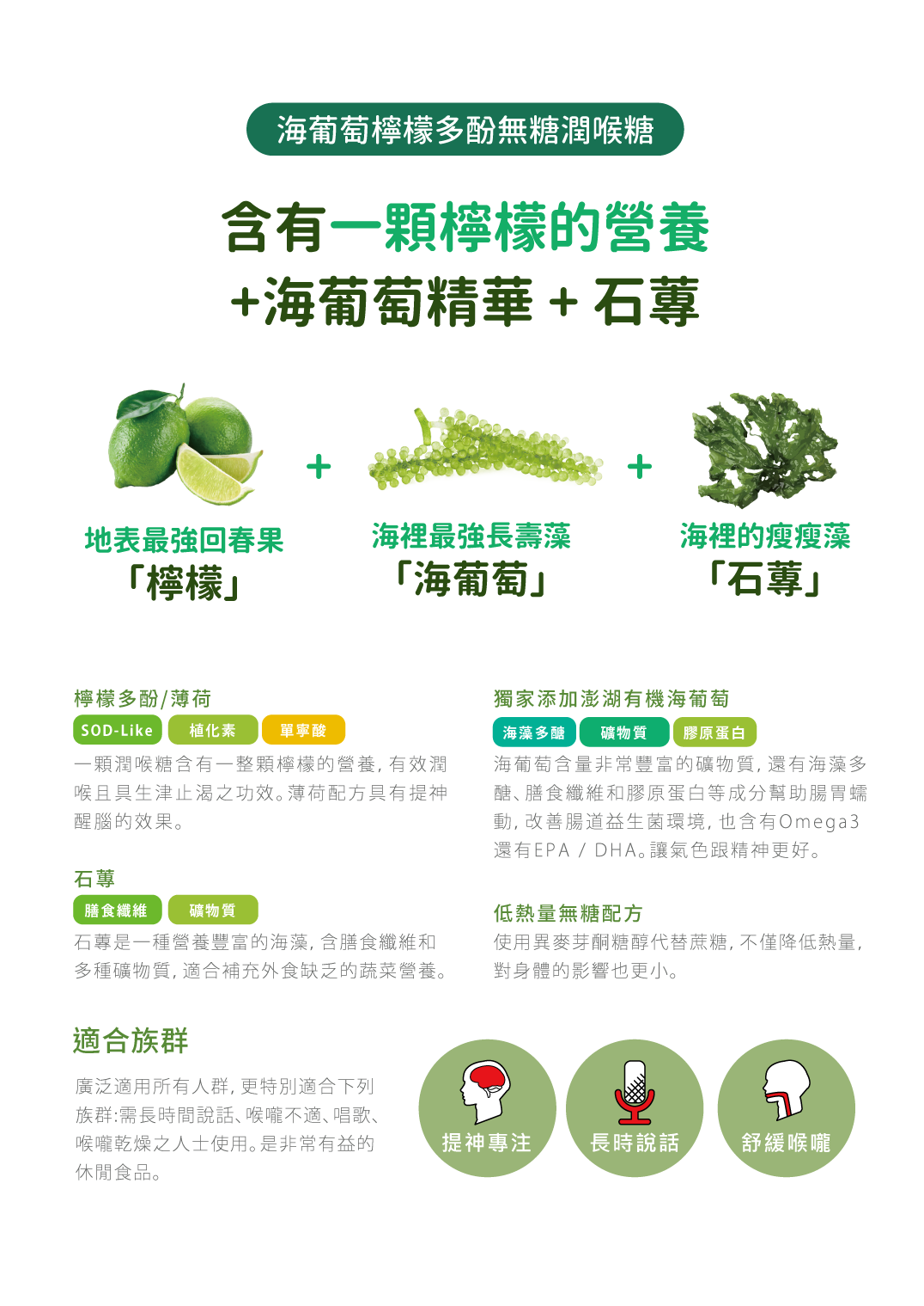 每一顆裡面都有豐富的檸檬多酚(含SOD-like) 再加上來自澎湖的海葡萄精華 快速潤喉提神,清涼又爽快!