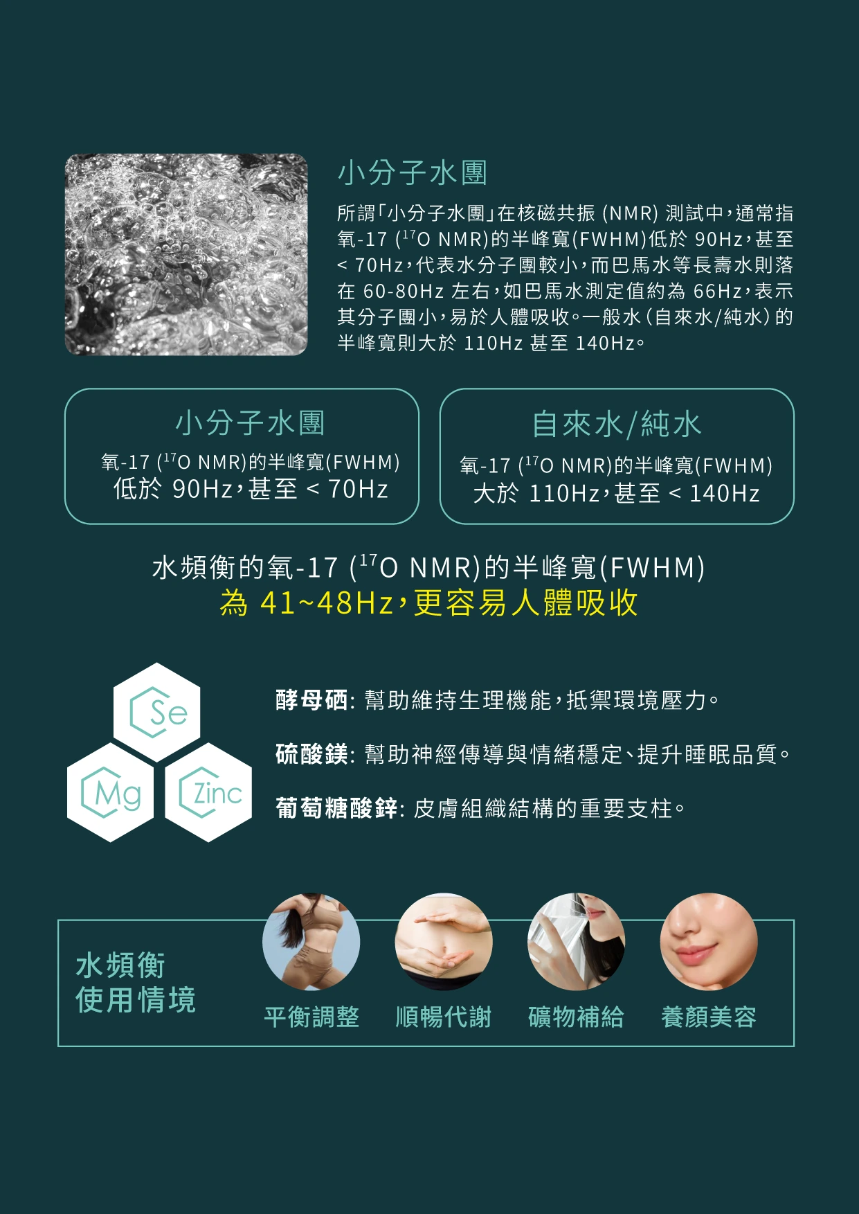 通常指 氧-17 (¹⁷O NMR)的半峰寬 (FWHM) 低於 90Hz,甚至 < 70Hz,代表水分子團較小,