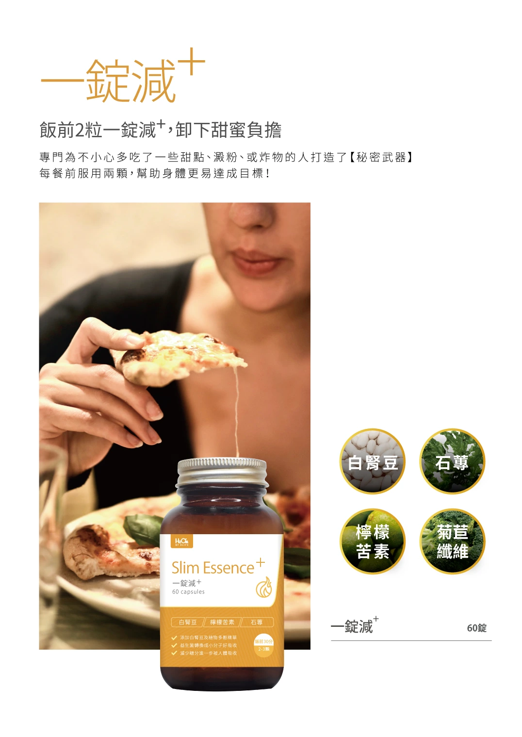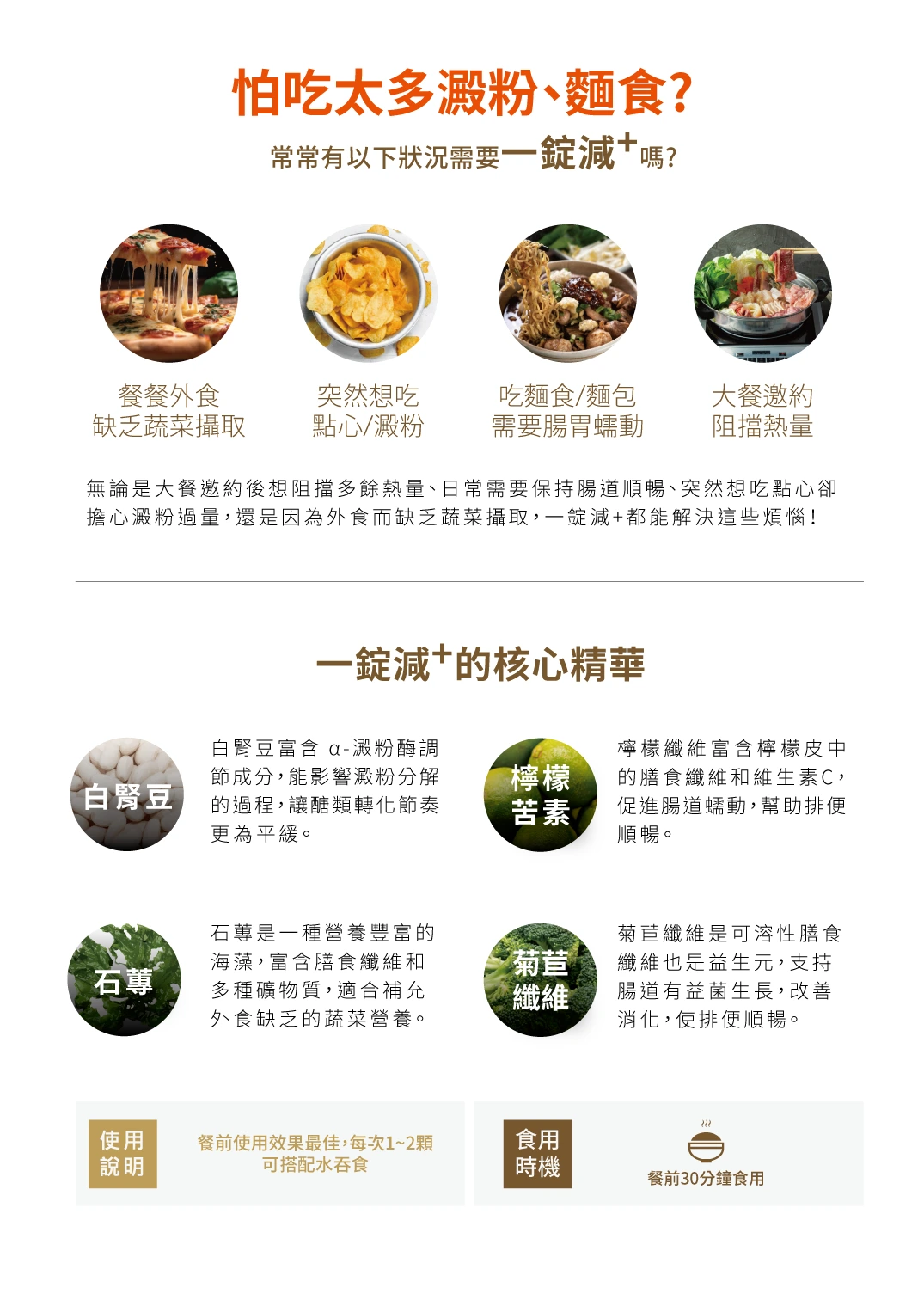 專門為不小心多吃了一些甜點、 澱粉、或炸物的人打造了【秘密武器】 每餐前服用兩顆,幫助身體更易達成目標! 白腎豆:協助愛吃澱粉的人,不讓糖分進一步被人體吸收。 菊苣纖維:可溶性膳食纖維可以使排便順暢, 養顏美容。 石蓴:是一種營養豐富的海藻,富含膳食纖維和多種礦物質,適合補充外食缺乏的蔬菜營養。 檸檬苦素纖維粉: 幫助維持消化道機能, 改變細菌叢生態。